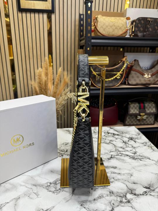 Michael_Kors Signature Chain Shoulder Bag With Leather Trim (Black)(62306)